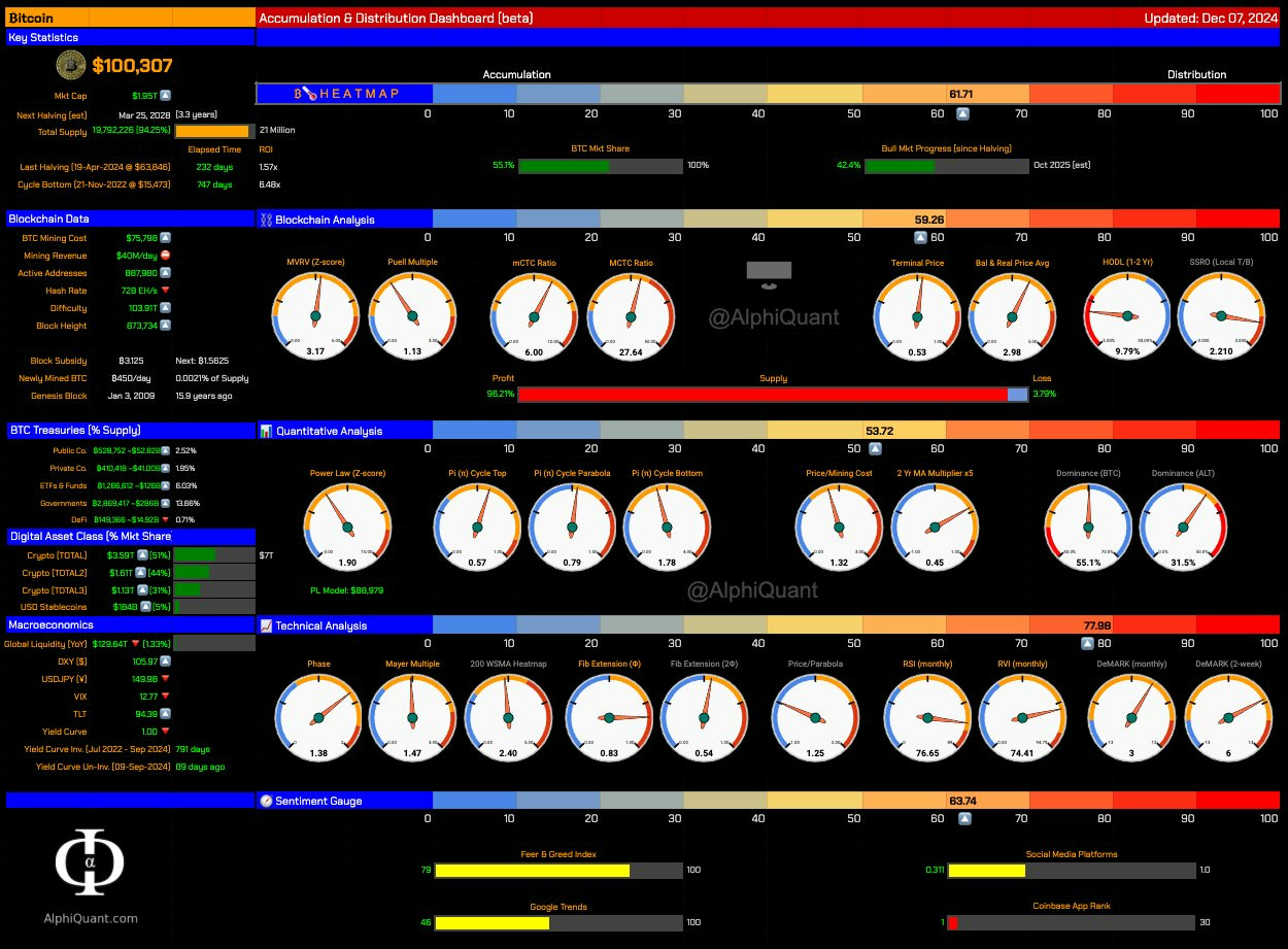 🧭 ₿ Accumulation & Distribution DashboardNovember 2024AlphiQuantDec 08, 20241Share₿ Accumulation & Distribution Dashboard🗓️ November 2024🌡️ Heatmap: 67.71🔼 🤑 Sentiment Gauge: 63.74🔼⛓️ Blockchain Analysis: Points to local top being in or is near.Follow @AlphiQuant on 𝕏Thanks for reading AlphiQuant Dashboard! Subscribe for free to receive new posts and support my work.SubscribePrevious